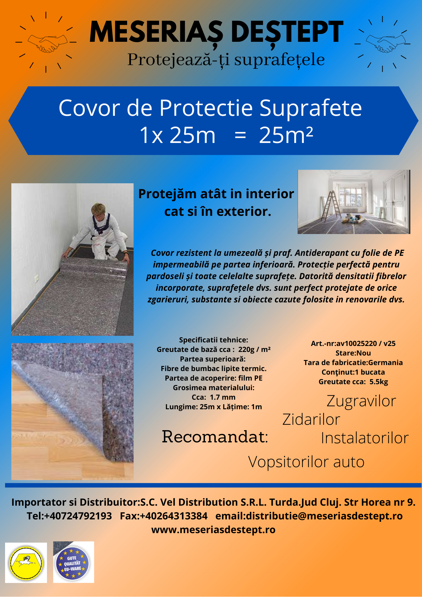 Covorul de protectie este oferit cu un gramaj de 220 gr / m2, este disponibil pe o rolă cu lungimea de 25 m. Lățimea benzii este de 1 m. Această dimensiune permite o manipulare ușoară atunci când derulați și rulați materialul.